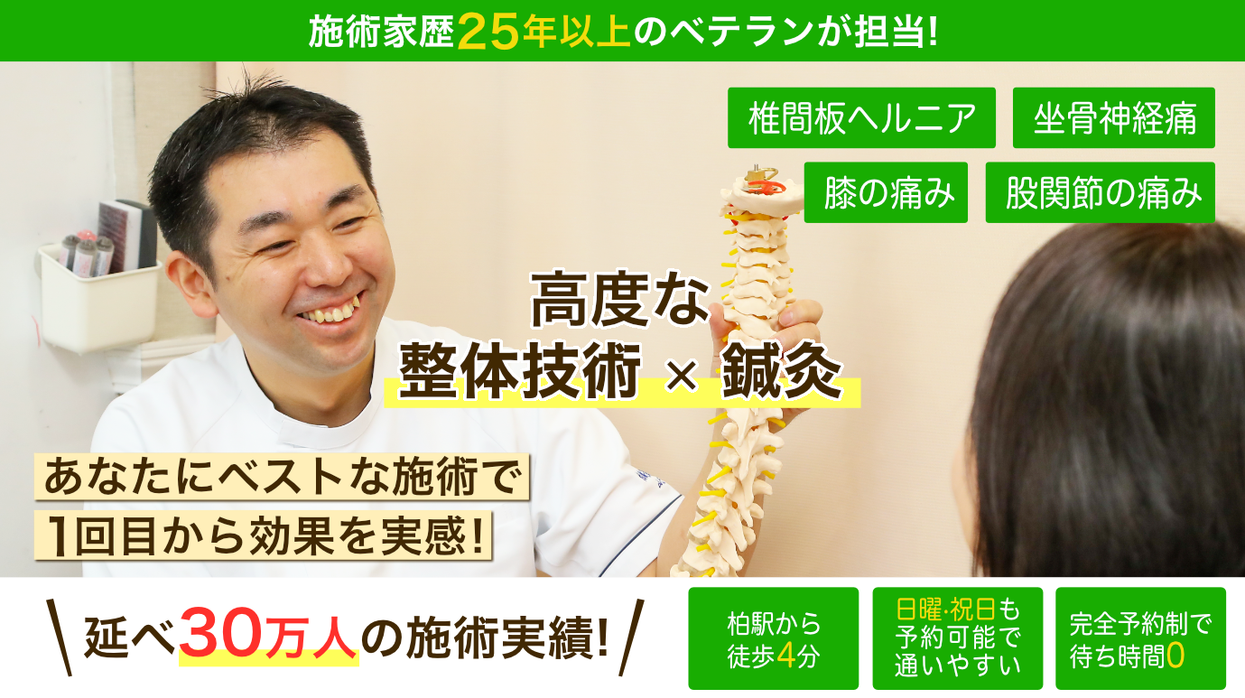 柏の地域の皆さんを椎間板ヘルニア・坐骨神経痛・膝痛・股関節痛などの長引く痛みから解放したい。
